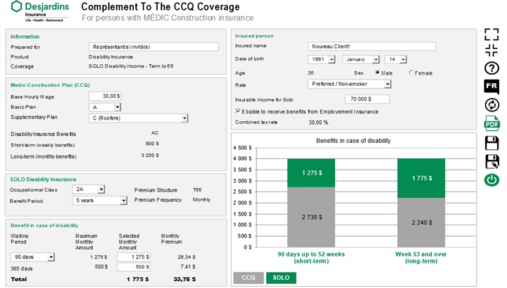 - Enter the information specific to the MÉDIC Construction plan for the proposed insured. The graph will automatically adjust based on the information entered, and the maximum amount available for SOLO Disability Income will be displayed.