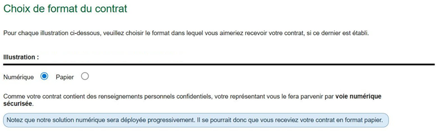 Choix de format du contrat a été ajoutée dans la proposition électronique pour vous permettre d’offrir la version numérique du contrat. Cette case est affichée pour tous les produits. Toutefois, le contrat numérique sera disponible uniquement pour l’assurance vie avec participations pour le moment.